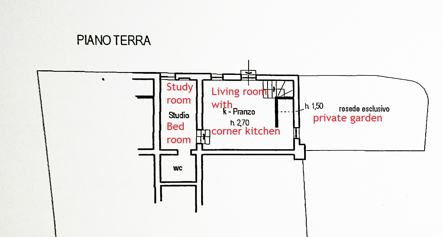The ground floor features a welcoming living/dining room with a pellet stove, a corner kitchen, and a studyroom used as a bedroom with a bathroom. This level also includes a private garden of approximately 40 m².