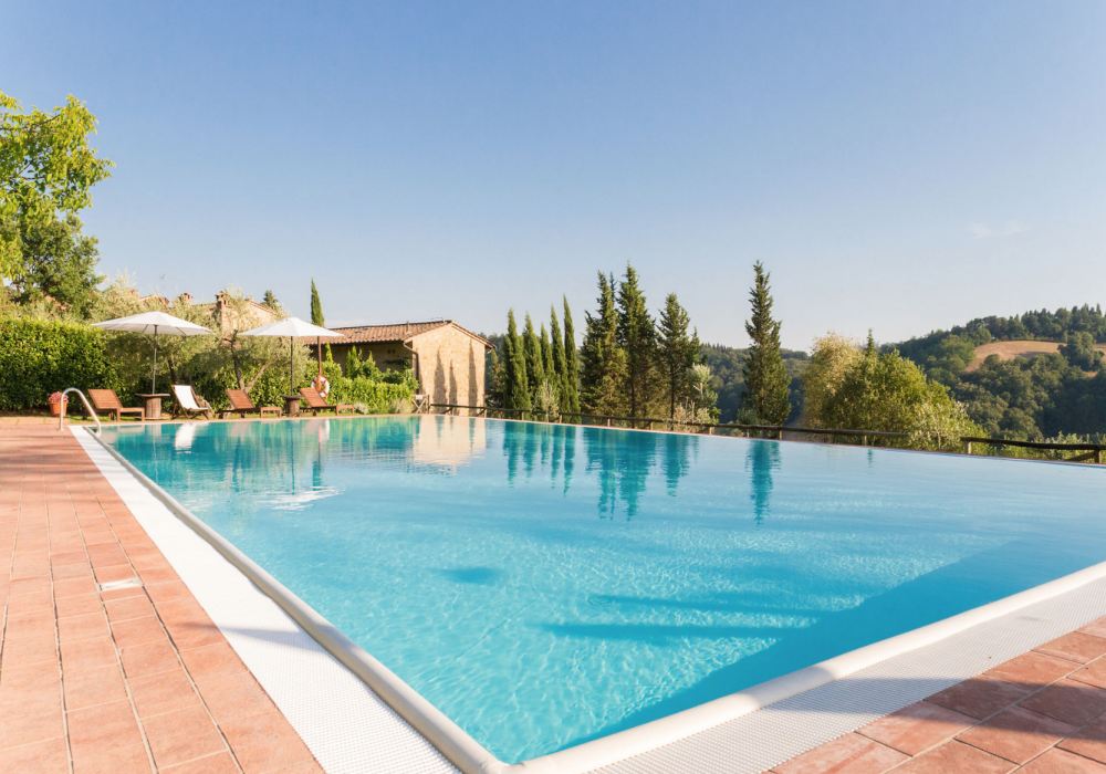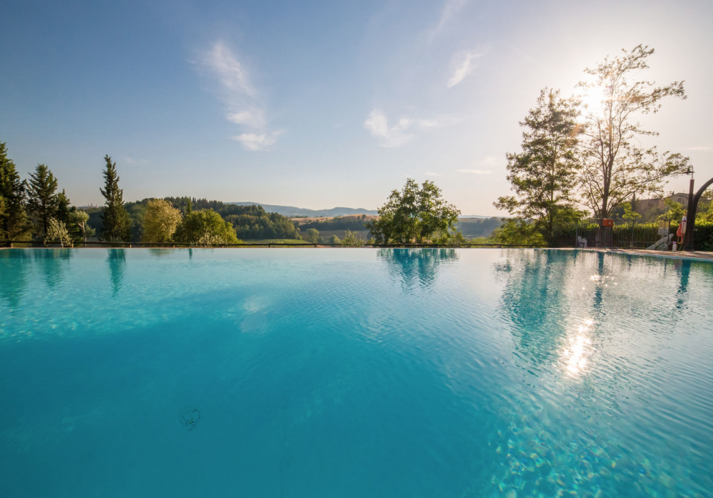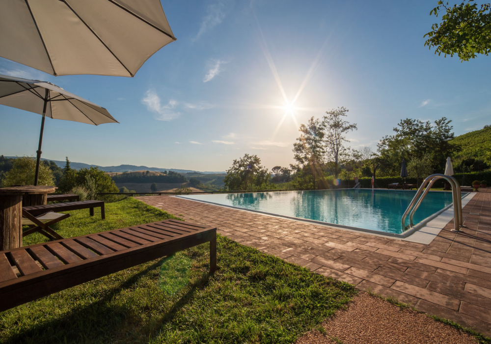 The swimming pool and its solarium, set in a splendid panoramic position with views of the countryside and San Gimignano in the distance, are ideal for relaxing on hot summer days.